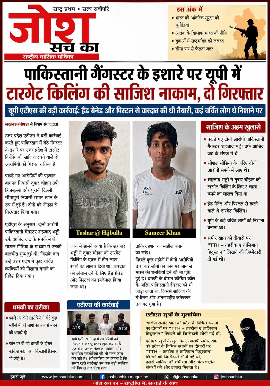 लखनऊ/नोएडा। उत्तर प्रदेश एटीएस ने बड़ी कार्रवाई करते हुए पाकिस्तान में बैठे गैंगस्टर के इशारे पर उत्तर प्रदेश में टारगेट किलिंग की साजिश रचने वाले दो आरोपियों को गिरफ्तार किया है। पकड़े गए आरोपियों की पहचान बागपत निवासी तुषार चौहान उर्फ हिजबुल्ला और पुरानी दिल्ली के सीमापुरी निवासी समीर खान के रूप में हुई है। दोनों को नोएडा से दबोचा गया।