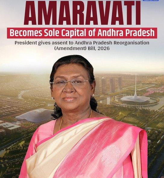 नई दिल्ली/अमरावती। द्रौपदी मुर्मू ने आंध्र प्रदेश पुनर्गठन (संशोधन) विधेयक 2026 को अपनी मंजूरी दे दी है। इस महत्वपूर्ण संवैधानिक कदम के साथ अमरावती को आधिकारिक रूप से आंध्र प्रदेश की एकमात्र और स्थायी राजधानी घोषित कर दिया गया है।
